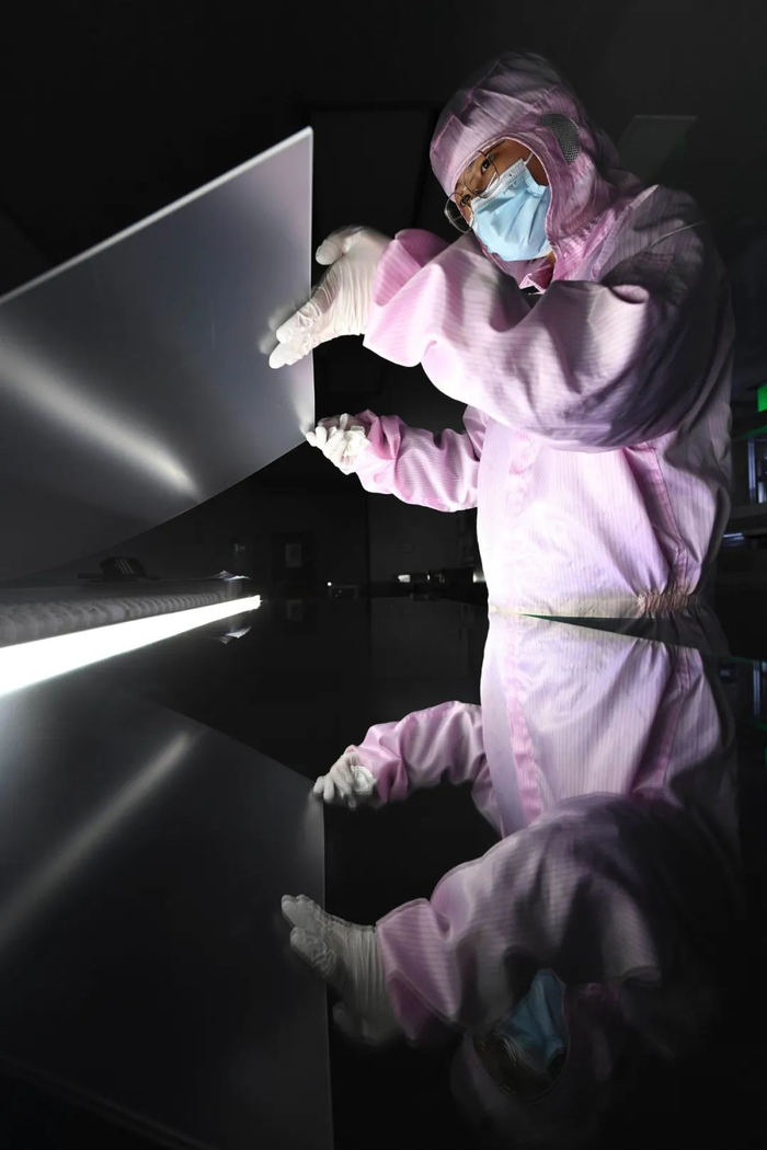 2月19日,在合肥泰沃达智能装备有限公司检验覆膜室,工人正在对导光板进行灯检。(张大岗 摄/ 视觉中国供图)