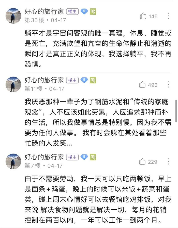 近来火起来的一位「躺平学大师」,出身于百度贴吧的「中国人口吧」。骆华忠(更多人会叫他「忠哥」)以@好心的旅行家 的id开贴展示了自己的生活:不上班、不劳动,一天只吃两顿饭,每月的花销只需要两百+。