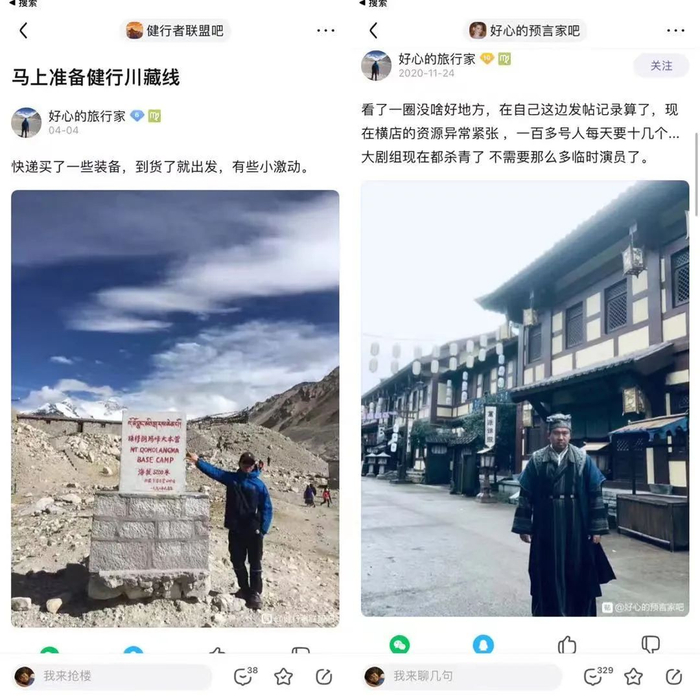 同游的朋友是网络上认识的。这几年我一直在玩贴吧,陆陆续续地记录自己的生活,比如躺平啦、在横店当群演啦、出去徒步啦,都是我在贴吧记录过的。我有一根自拍杆,你们看到的那些照片也都是自己给自己拍的。