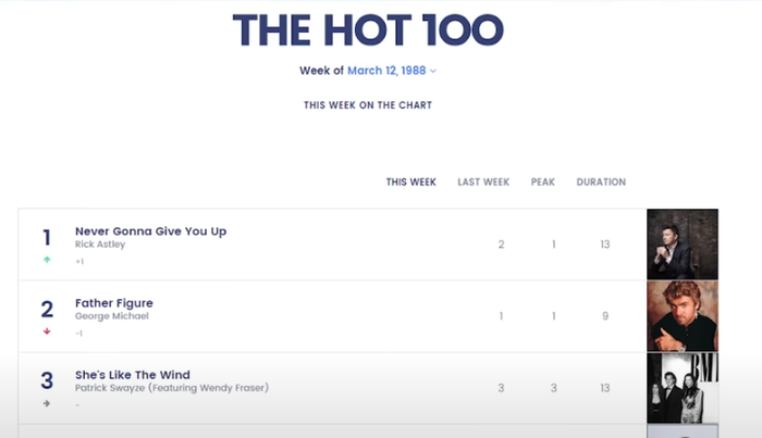 这首歌发布于1987年,当时的Rick Astley才21岁,却凭借这首歌一炮而红,在英国和美国的排行榜上霸占了好久的第一。