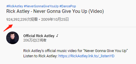 2009年的时候,Rick Astley的官方油管频道上传了《Never Gonna Give You Up》的正版MV,这个视频如今已经超过9亿次的播放了。