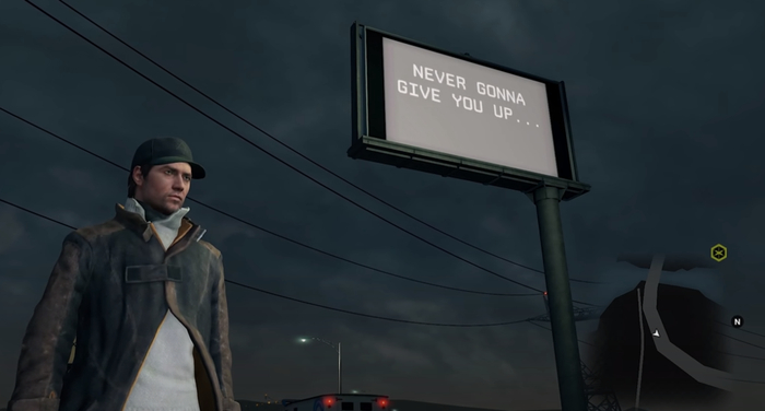 育碧的《看门狗》里,我们可以在城市里看到很多被黑客黑掉的屏幕,会显示一些意义不明的话,其中有一块上面就显示了“NEVER GONNA GIVE YOU UP”。