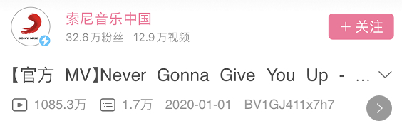 b站的索尼音乐中国官方把《Never Gonna Give You Up》的视频上传之后,目前已经有了一千多万的播放量。