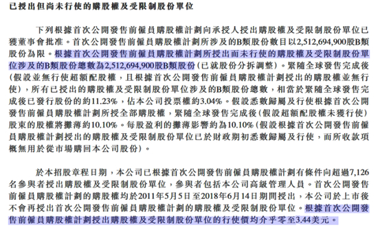以小米为例,根据招股书披露的数据,计划已授出而未行使的购股权和受限制股份单位占上市后公司总股份的11.23%,约占投票权的3.04%,其中购股权B类股份总数为为2,237,613,083股,所涉股份已全部授出,授予人数达到7126人,平均行权价格在0至3.4美元之间。