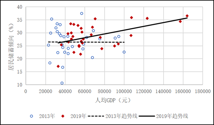 从图2显示的各地区居民储蓄倾向与区域人均GDP的相关性来看,2013-2019年中国高收入地区的居民储蓄倾向明显上升更快。从城乡对比看,2013-2019年中国城镇居民储蓄倾向从30.1%提高到33.7%,农村居民储蓄倾向则从20.6%下降到16.8%。这些对比从不同方面说明合理的收入调节对于平衡居民需求结构和储蓄结构是必要的。