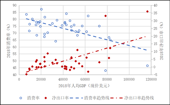图3 经合组织国家消费率、净出口率与人均GDP相关性