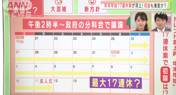 在去年年底的时候,曾经有日本节目表示,2021年有可能要迎来一次17日的大连休了,因为政府考虑到回老家、新年参拜等各类人员密集的活动会导致新冠疫情进一步扩大,而如果增加放假的天数的话,人们可以分批次地进行活动了,从而减少感染的风险,因此计划要将假期增加到17天。