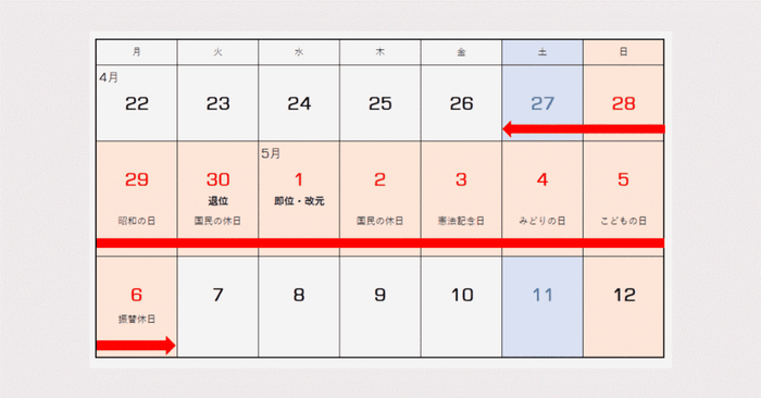 当时的5月2日其实是个工作日,但是因为夹在了即位日和宪法纪念日之间,就变为了休息日。而5月5日的儿童节是在周日,所以6日补假一天,也成了休息日,于是乡民们就拥有了愉快的10天长假。