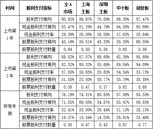 由表2可知,从全A市场来看,上市公司的股利支付倾向在上市后的前两年均高于全时间段的平均水平,表现出一定程度的融资分红特征。从板块角度来看,两市在现金股利支付方面均有融资分红特征,但沪、深交易所主板并没有明显的高送转特征,而中小板和创业板在上市初期的高送转特征十分明显。可见,中小板和创业板公司股利支付行为具有较明显的融资分红特征。