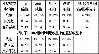 如表3所示,相对于无风险利率,上证综指的平均超额收益率为17.59%,深证成指和中小板指与之相当,而创业板指的超额收益率最低,仅为8.95%,但从风险角度看,创业板指的风险最高。相比而言,中小板指和上证综指的投资收益比更好。从投资收益分布看(见表4),我国主要指数年度收益率在大部分年份均不能超过当年无风险利率,即使在2010年之后大部分年份的超额收益也均为负,其中中小板指数表现相对较好。由此可见,我国资本市场的资本利得效应相对较弱,对投资者择时能力要求很高。