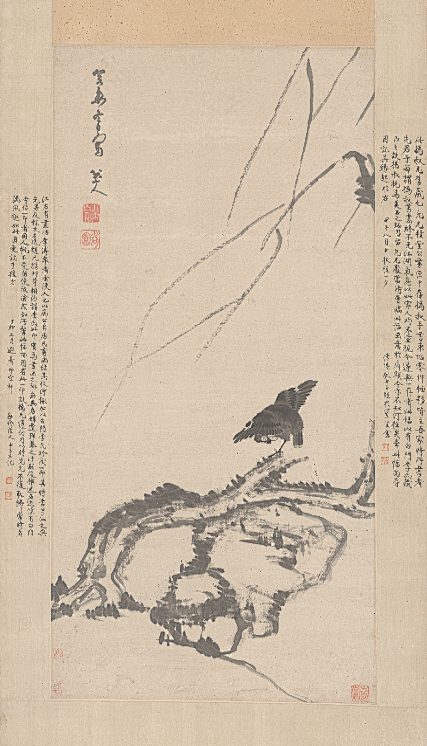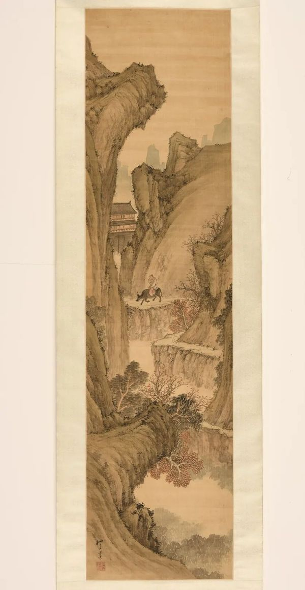 朱耷、郭诩、吴宏、闵贞四位都是职业画家,他们绘画风格各有特点,都在中国书画史上留下了深刻的印记。此次借展的《杨柳浴禽图轴》《山水图轴》都是八大山人朱耷晚年成熟期画作,分别是水墨花鸟画和山水画的的代表性精品,构图用墨精到,个人风格鲜明;郭诩是明代中期画家,擅画人物,《寿星图》体现了他工写兼备的艺术成就。“金陵八家”之一的吴宏与“扬州八怪”之一的闵贞分别画景写人,景致笔墨雄阔,人物奇纵超逸。闵贞的《巴慰祖像》用细笔勾勒粉彩渲染,为清代著名书法篆刻家巴慰祖绘像,十分难得。