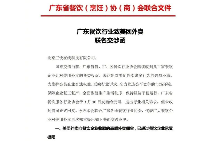 林林总总,商户们对于美团是既依赖又恨。去年4月,广东省餐饮协会发布《广东餐饮行业致美团外卖联名交涉函》,直指美团的垄断和高佣金让众多餐饮商家不堪重负。