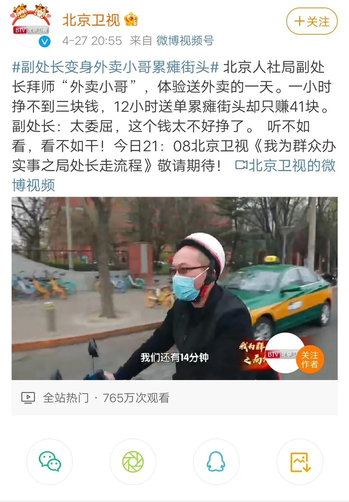 五一前,北京市人社局劳动关系处副处长王林体验了一天送外卖,跑了12小时,人快累瘫了,只赚到41元。