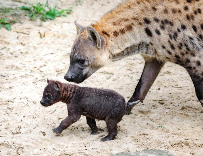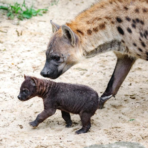 今年2月20日,上海动物园一头母斑鬣狗首次诞下幼崽。斑鬣狗妊娠期较长,约三至四个月,幼仔出生时便能睁眼,牙齿也已生成,还会下地走路,这在食肉类哺乳动物中很少见。但幼仔存活极其不易,因此出生时体型往往会长得比较大。它们出生时必须经过长达60厘米的产道才能到达母亲体外,很容易在这段“艰难路”上窒息死亡。此外,为了获取更多母乳和来自母兽的保护,彼此之间一出生就会进行争斗,体格弱小的往往无法赢得生存机会。