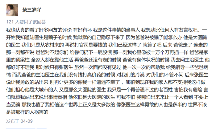 关于开篇那个提问,还有另一条高赞回答——“医学我们或许不懂,但对人性每个人心里都有一杆秤。”