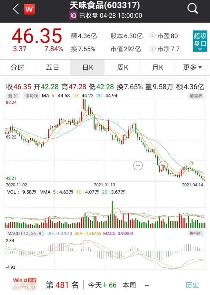 自今年一月起,天味食品股价大幅下挫,截止4月28日报收46.35元,距1月时高点跌幅超过40%,相比当时的增发价格也下跌了18.68%,易方达中小盘目前浮亏1.12亿元。