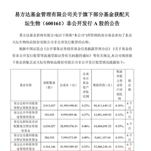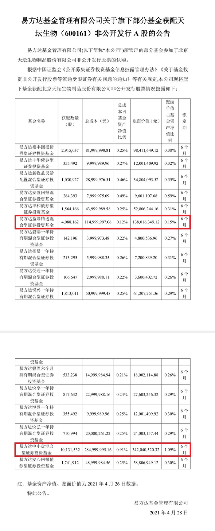 4月28日,易方达基金发布关于旗下部分基金获配天坛生物非公开发行A股的公告,旗下包括易方达裕丰回报、易方达丰华债券在内16只基金集体参与天坛生物定增,合计获配2680.41万股,获配金额达到7.54亿元,最为引人关注的是,明星基金经理张坤所管的易方达中小盘及易方达蓝筹精选也参与了此次定增。