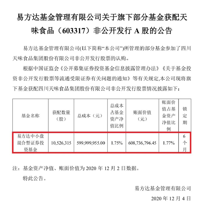 不过,天味食品的定增暂时还处于浮亏状态,去年12月2日,易方达中小盘以57元的增发价参与天味食品定增,获配1052.63万股,获配金额接近6个亿。