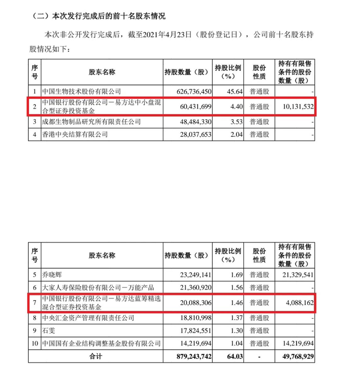 本次非公开发行完成后,截至2021年4月23日,易方达中小盘混合持有天坛生物6043.17万股,持股比例达到4.40%,从四季度末的第三大流通股股东晋升为第二大流通股股东;易方达蓝筹精选持有2008.83万股,持股比例为1.46%,新进前十大流通股东之列。