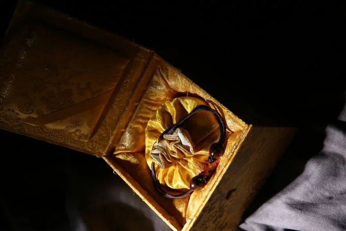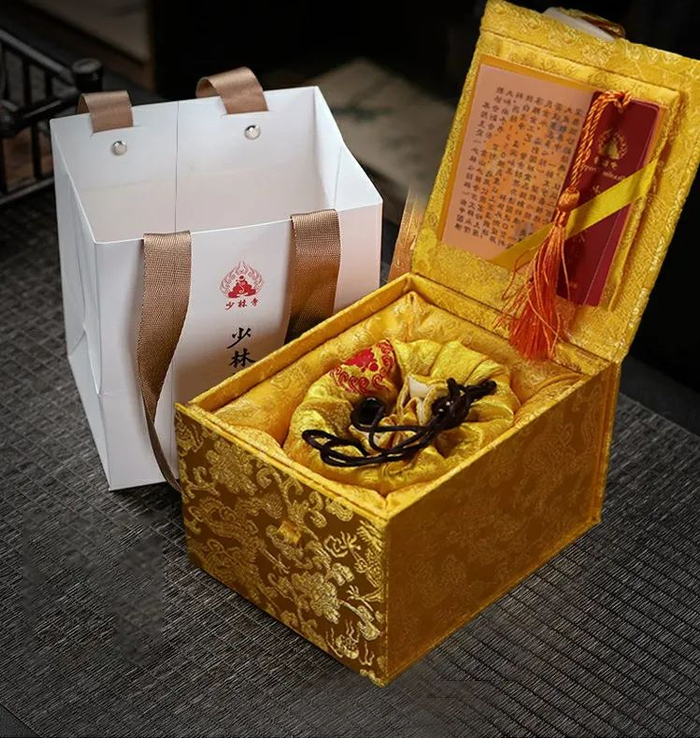 少林心经杯包装精致,正黄锦盒包装,内置海绵仿真防损。同时还配有一个黄色锦袋,方便把少林心经杯被随身携带。