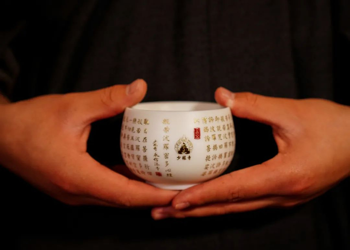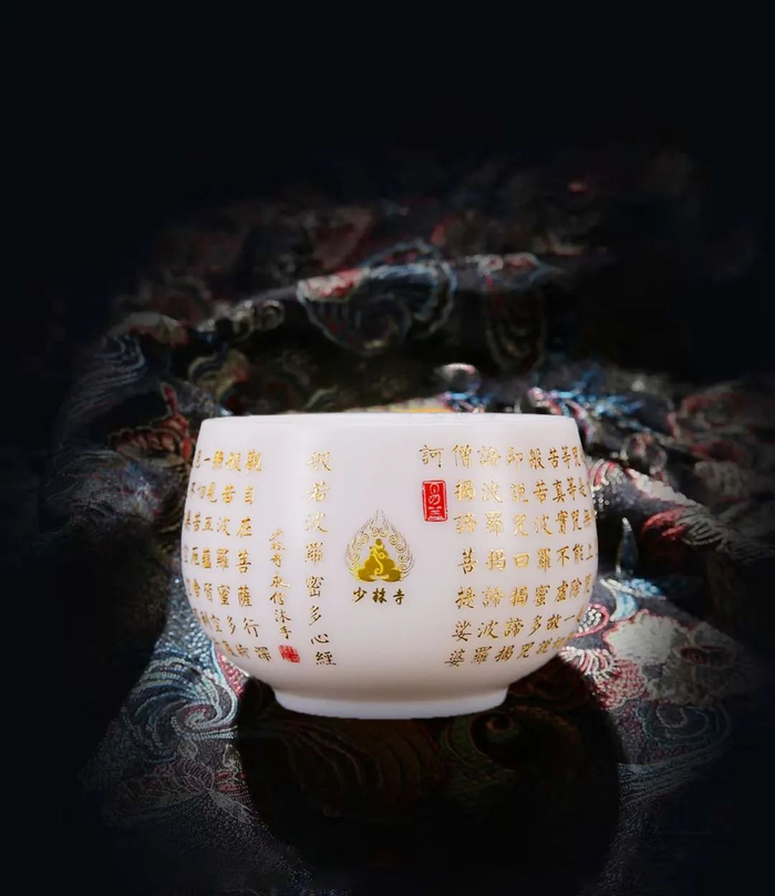 杯子上的般若波罗蜜多心经,是方丈释永信沐手恭抄,全经260字,恰写满杯身,可见设计之巧思。