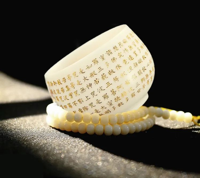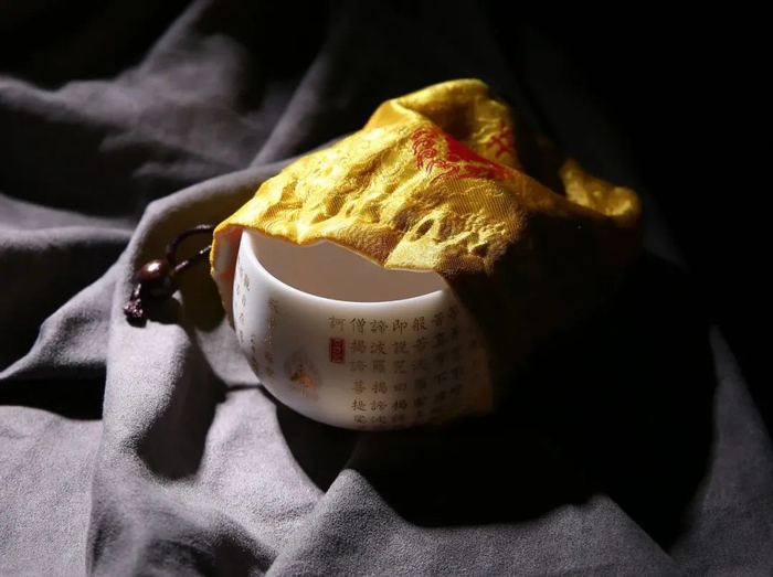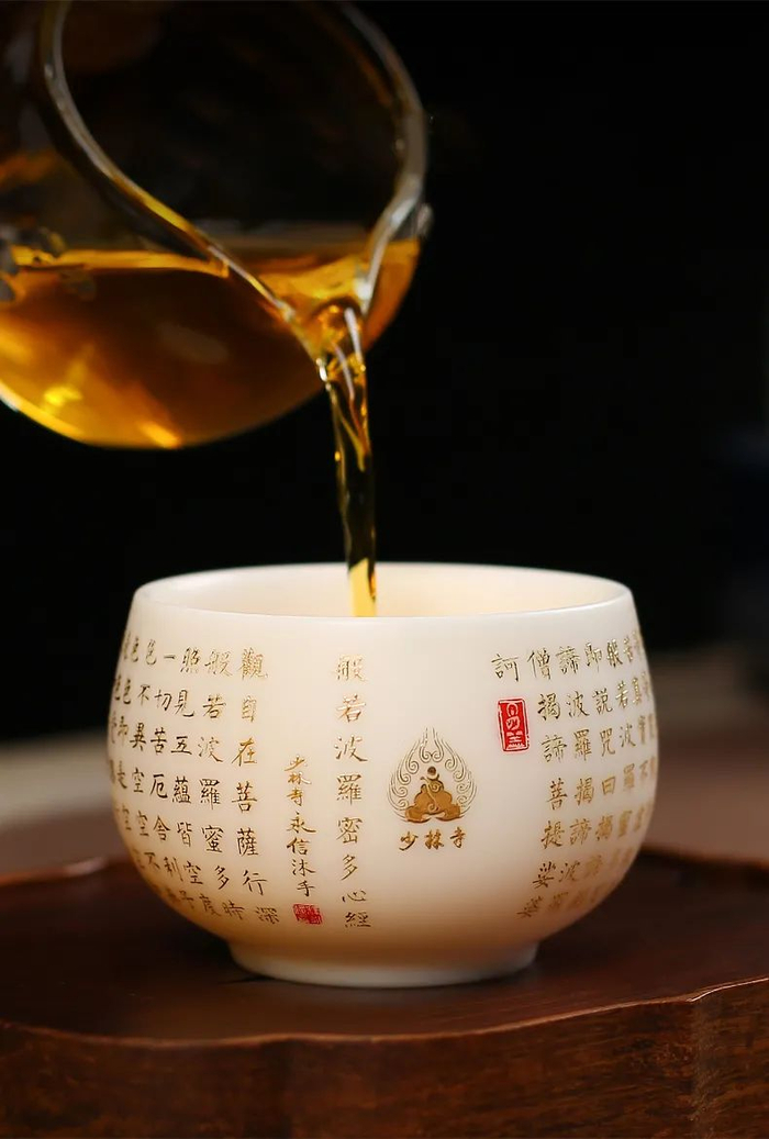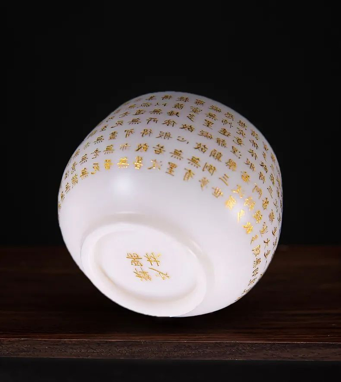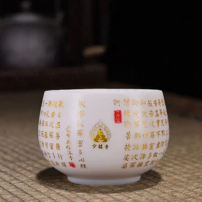 羊脂玉少林心经杯将禅茶一味展现得淋漓尽致,白壁温润,宛若凝脂,浮雕心经,触感立体。