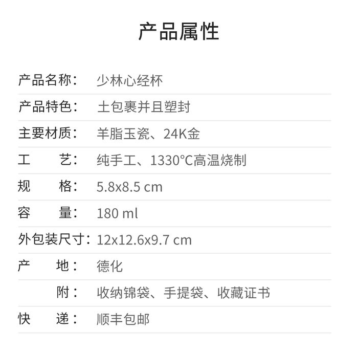 好产品匠心制,少林心经杯纯手工打造,更严苛的中国白材质用料,成本是普通白瓷颜料的十倍,采用国家级白瓷非遗烧制技术,每一个杯子都经过206小时的制作:48个细节处理,72道陶瓷工艺,反复修补调整,最后1350℃高温烧制成器。