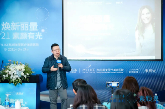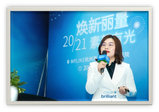 必正医药公司徐琴总监为参会人员详细介绍了新型智能点阵激光CLEAR+BRILLIANT素颜光的优点和功能。作为一款轻奢型智能激光,美国Solta Medical索塔医疗的Clear+Brilliant(C+B)素颜光以“微治疗”、“重保养”的全新理念为研发初衷,设计出温和型Clear+Brilliant雷射美肤技术,该技术特别对推迟、预防老化,改善肌肤斑点和毛孔肤质等问题有显著效果,成为焕肤美肌技术领域的新宠儿。