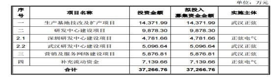 招股书显示,正弦电气此次公开发行的A股不超过2150.00万股,拟募集资金37,266.76万元,其中14,371.99万元用于生产基地技改及扩产项目,9878.30万元用于深圳、武汉的研发中心建设项目,5876.81万元用于营销及服务网络建设项目,7139.66万元用于补充流动资金。