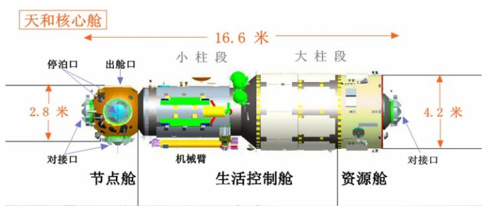 其中,“天和”核心舱全长 16.6 米,最大直径 4.2 米,发射质量 22.5 吨,有五个对接口,可以对接一艘货运飞船、两艘载人飞船和两个实验舱,另有一个供航天员出舱活动的出舱口,是未来空间站的管理和控制中心。