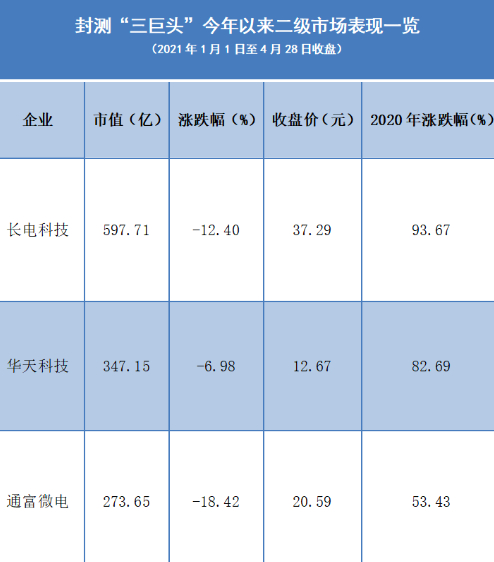 而在二级市场方面,2020年,长电科技、华天科技与通富微电股价累计涨跌幅分别为93.67%,82.69%与53.43%,长电科技领涨。截至4月28日,三者股价市值分别为597.7亿元、347.2亿元与273.6亿元,长电科技市值也是领先。今年以来,封测“三巨头”股价均出现了一定程度的下滑,长电科技、华天科技与通富微电累计涨跌幅分别为-12.4%,-7%与-18.4%,通富微电领跌,华天科技跌幅最小。