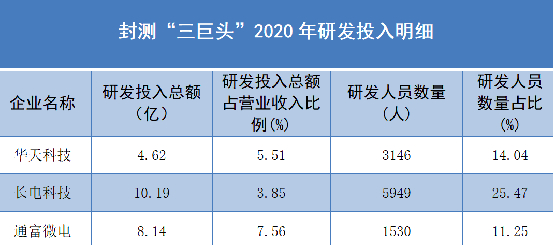 除了产能,研发能力是半导体企业的基本。从封测“三巨头”2020年研发投入明细来看,长电科技研发人员最多,为5949人,通富微电最少,为1530人。但在研发投入总额占营业收入比方面,通富微电最高,为7.56%,华天科技为5.51%,长电科技仅为3.85%。