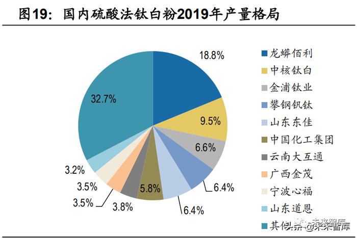 (1)钛白粉龙头规模优势明显。根据钛白粉产业技术创新战略联盟,2019年 国内钛白粉综合有效产能达到384.5万吨,其中硫酸法346万吨,氯化法38.5万吨, 硫酸法前两大龙头企业分别为龙蟒佰利、中核钛白,产能分别达到65万吨和33万吨, 占比18.8%和9.5%。氯化法工艺更为高端,龙蟒佰利以26万吨产能、67.5%的市占 率大幅领先。总体来看,龙蟒佰利作为钛白粉龙头领先优势较大,第二梯队包括中 核钛白、金浦钛业等五家市占率较为接近的企业。2019年全行业产能利用率83.68%, 其中大中型企业产能利用率普遍较高。