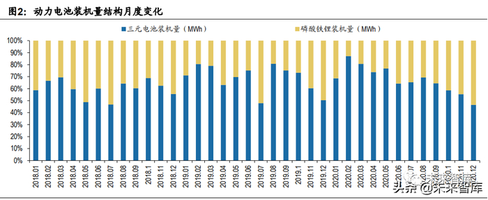 磷酸铁锂趋势回暖,2020年底开始大幅放量。2019年后新出台的补贴政策淡化 能量密度和续航指标,开启了以高安全性、低成本为导向的补贴政策新周期,新能 源汽车逐步回归市场化需求,同时补贴政策的退坡与平价周期的来临迫使企业选择 成本更低的动力电池,磷酸铁锂行业景气度逐渐回暖。据中国汽车动力电池产业创 新联盟,2020全年磷酸铁锂电池装车量累计24.4GWh,同比增长20.6%,占总装车 量38.3%,同比增长15.6%,是装车量整体增长的主要驱动力,而同期三元电池装车 量同比下降4.1%。分季度看,2020年Q4磷酸铁锂电池共计装车14GWh,同比上升 149.3%,环比上升69.1%,同期三元电池装车量同比仅上升32.3%,环比上升2.2%。磷酸铁锂装机量占比从2020年初的12.83%提升至53.51%,增长趋势显著。