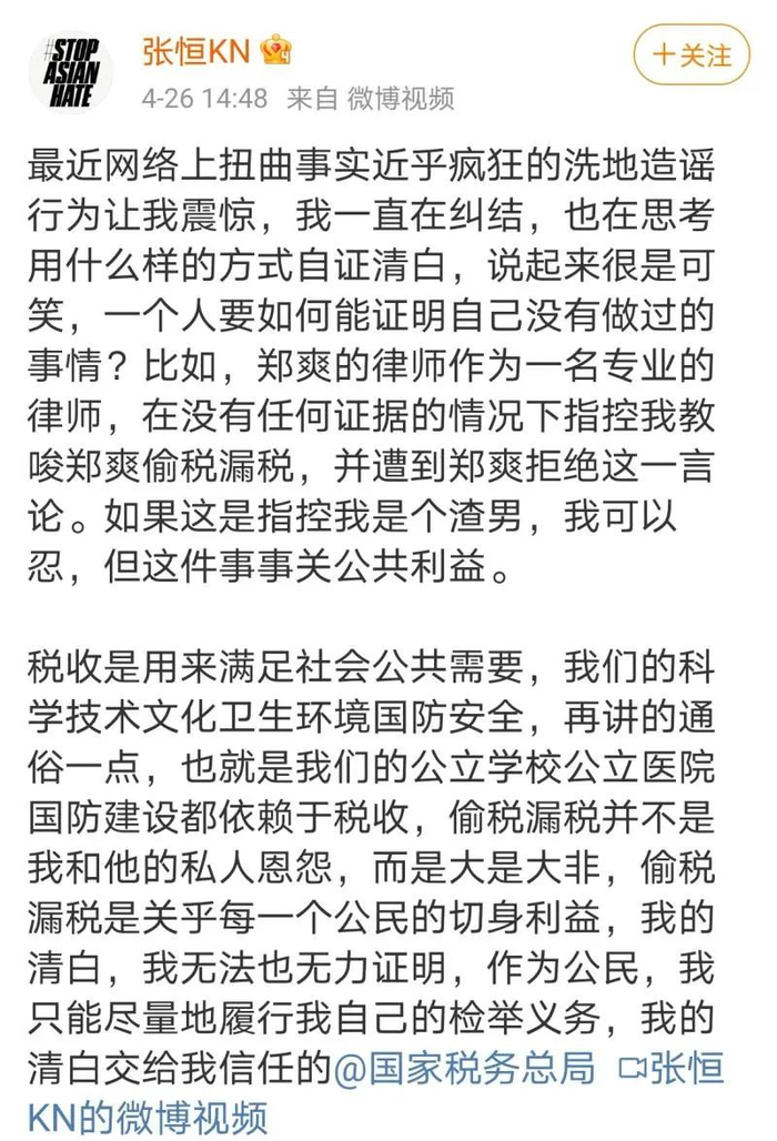其实,早在4月1日,张恒郑爽民间借贷纠纷案二审宣判的次日,张恒就曾发长文并配图,表示将放出郑爽涉嫌以“阴阳合同”逃税漏税的猛料。只是当时,所有人的注意力似乎都集中在张恒败诉上,郑爽逃税漏税一事没引起多少关注。