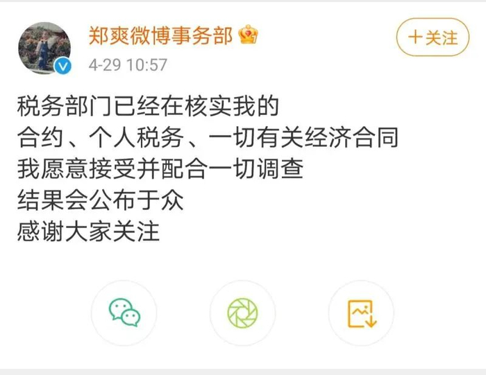在事情持续发酵后,4月29日上午10时57分,郑爽工作室在微博发表声明,“税务部门已经在核实我的合约、个人税务、一切有关经济合同。我愿意接受并配合一切调查,结果会公布于众,感谢大家关注。”截至发稿,该条微博转发1.7万,评论数3.2万,一边倒表态支持郑爽。