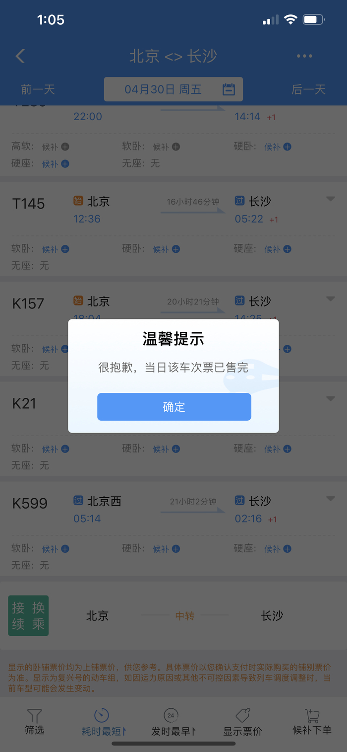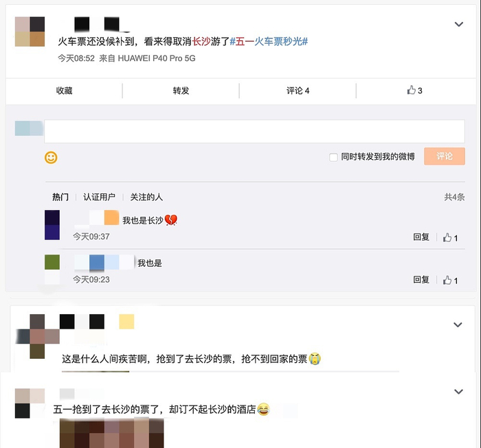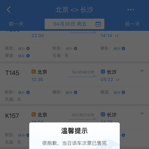 还有抢到了去程没抢到回程票的。澎湃新闻搜索中国铁路12306订票平台发现,以5月5日从长沙前往北京的火车为例,当日共36趟列车,仅剩一班耗时14小时42分钟的无座票及一班耗时21小时14分钟的硬座票。