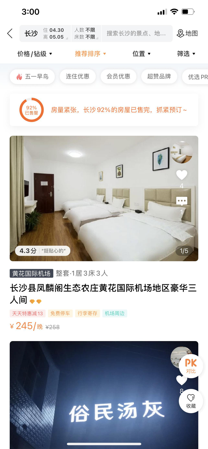 澎湃新闻搜索在线旅游平台发现,平日四五百元以内的酒店在今年5月1日至5月3日都卖到了1000元以上。以桔子水晶长沙芙蓉中路国金中心酒店为例,除了无窗的房间,4月30日至5月5日的其他房型都已售罄。从价格来看,该酒店4月30日的最低价格为533元,5月1日最低价1271元,5月2日最低价1691元;5月5日后的价格则回落至350元至500元不等。