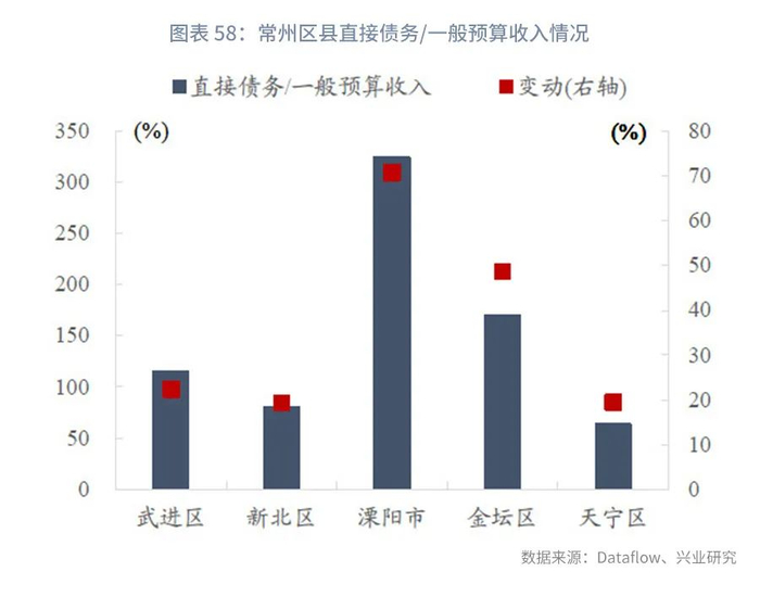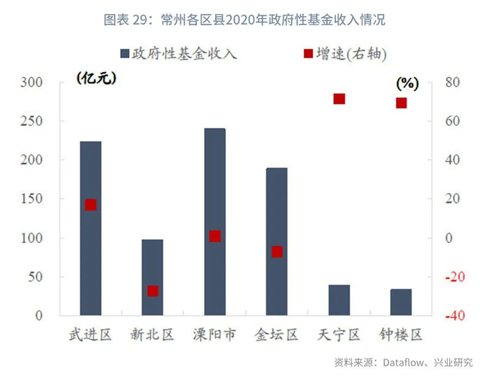 常州市各区县财政收入规模一般,各区县分化,除金坛区外全部实现一般预算收入正增长。其中,武进区、新北区的一般预算收入规模均处于全省前1/4;溧阳市、金坛区、天宁区均处于全省1/4-1/2分为水平内,其中金坛区出现一般预算收入下滑,同比降幅为3.3%;钟楼区一般公共预算收入规模最小,但增速最高,同比增长8.8%至51亿元。政府性基金收入方面,武进区、溧阳市、金坛区均超过180亿元,处于全省前1/4水平;天宁区和钟楼区规模较小,低于省内中位数,但增速较高,分别同比增长71%至39亿元和同比增长69%至33亿元。