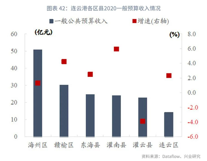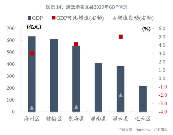 连云港市下辖区县的经济体量普遍较小,经济增速分化。连云港市下辖区县共6个,2020年GDP规模最大的是海州区(630亿元),最小的是连云区(215亿元).GDP可比增速方面,仅海州区、东海县、灌云县披露了增速数据,分别为3.0%、4.1%、5.0%。