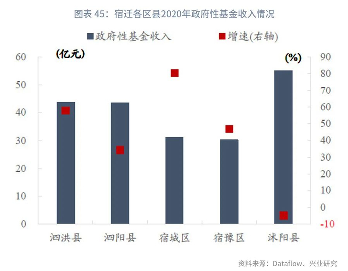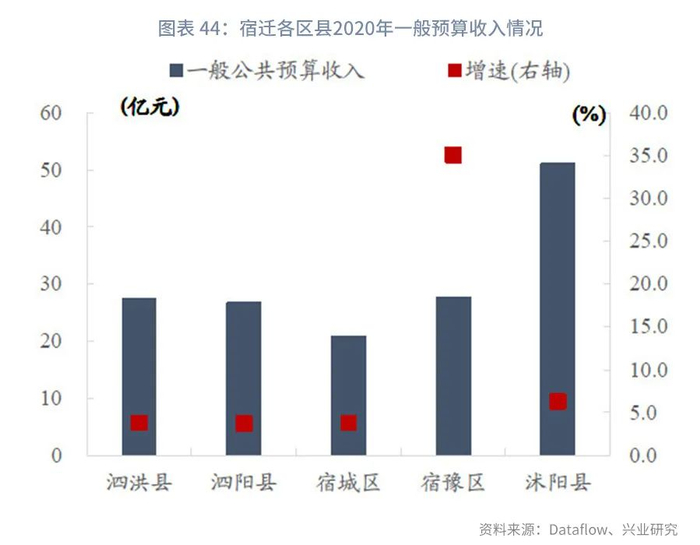宿迁市各区县财政收入规模较小,基本都处于全省下1/4分位。2020年一般预算收入全部实现正增长。5个区县中,仅沭阳县以51亿元的规模高于全省下四分位数;其他4个区县的一般预算收入规模均为20-30亿元,处于全省后25%。此外,宿豫区以高达35.1%的同比增速位列全省增速第一。政府性基金收入方面,仅沐阳县以55亿元的规模高于全省1/2分位水平,但同比增速仅为-5%,为全市唯一负增长区县;其他区县均处于全省1/2-3/4分位水平,其中宿豫区政府性基金收入规模最小但增速尚可,同比增长47%至30亿元。