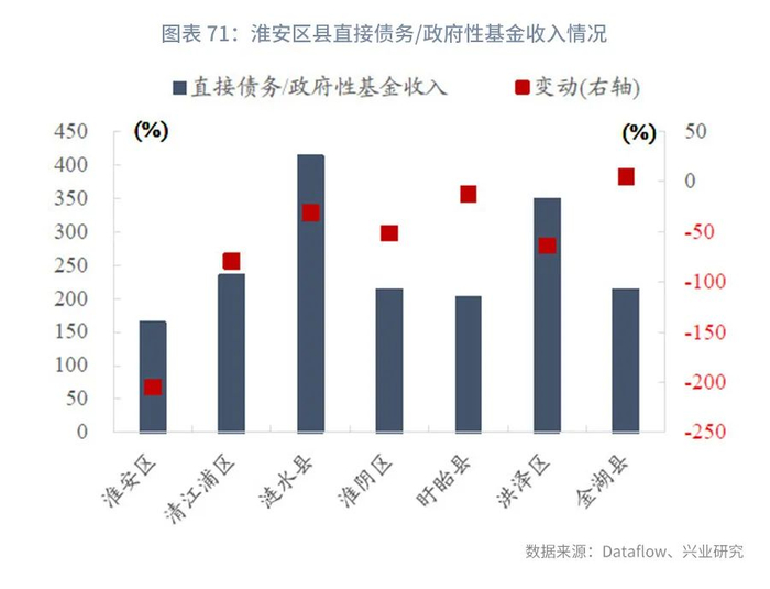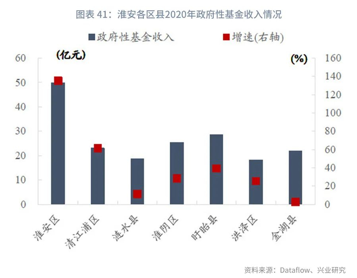 淮安市各区县财政收入规模较小,全部处于全省下1/4分位。7个区县中,清江浦区以30亿元的规模位居市内第一,但增速仅为-0.5%,为全市唯一负增长区县;盱眙县一般预算收入规模最小,同比增长1.0%至19亿元。政府性基金收入方面,除了淮安区以50亿元的规模高于全省下四分位数以外,其他区县均处于全省后25%区间内,区域土地成交热度较低。