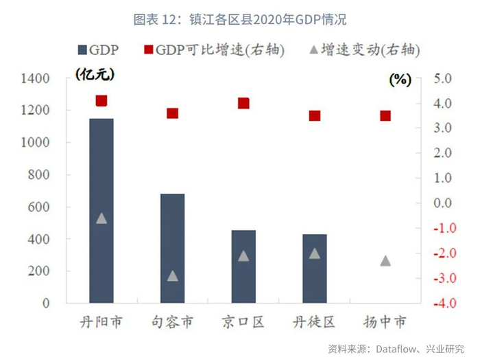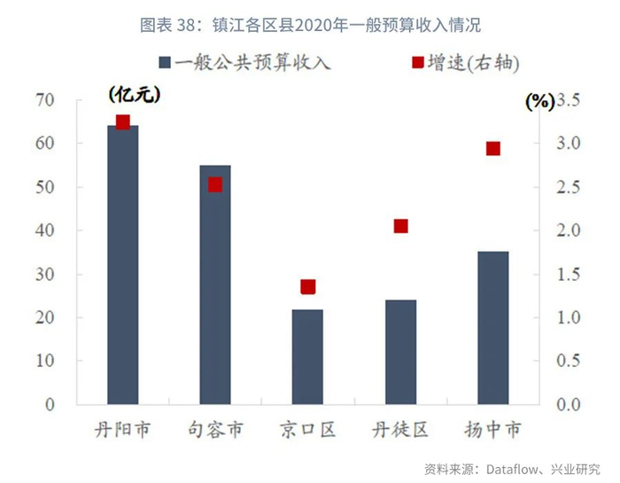 镇江市下辖区县的经济体量分化,经济增速一般。镇江市下辖区县共5个,扬中市尚未披露20年GDP规模,其他4个区县中,仅丹阳市的GDP规模处于省内前25%,剩余的句容市、京口区、丹徒区均处于省内后40%的水平。GDP可比增速方面,5个区县的增速分布于3.5%-4.1%不等,全部处于全省75%-25%的区间内,其中仅丹阳市、京口区的增速高于全省中值。