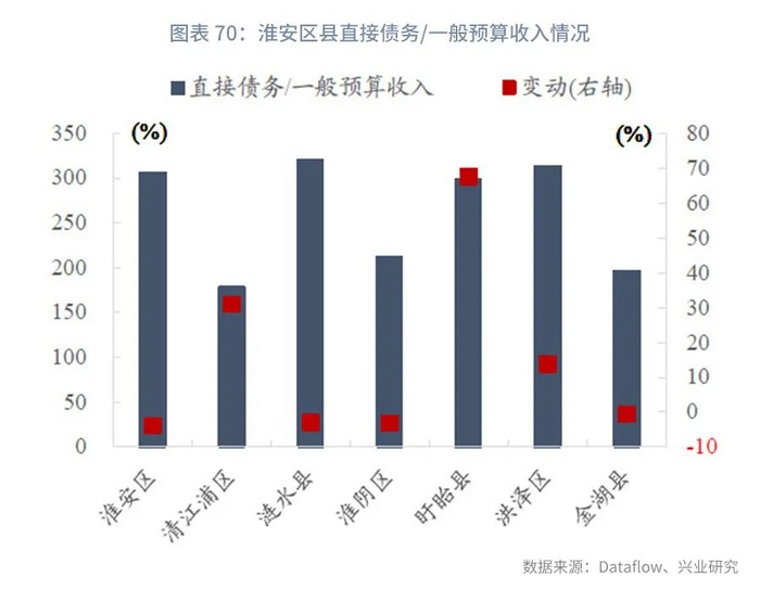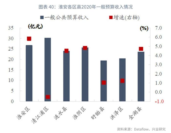 淮安市下辖区县的经济体量普遍较小,经济增速较低。淮安市下辖区县共7个,GDP规模最大的是淮安区,2020年为616亿元,在省内处于65%分位数左右,大部分区县都处于省内后25%的水平。GDP可比增速方面,各区县的增速都处于3.0%-3.5%之间,集中在省内后50%的水平。