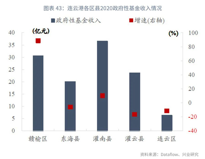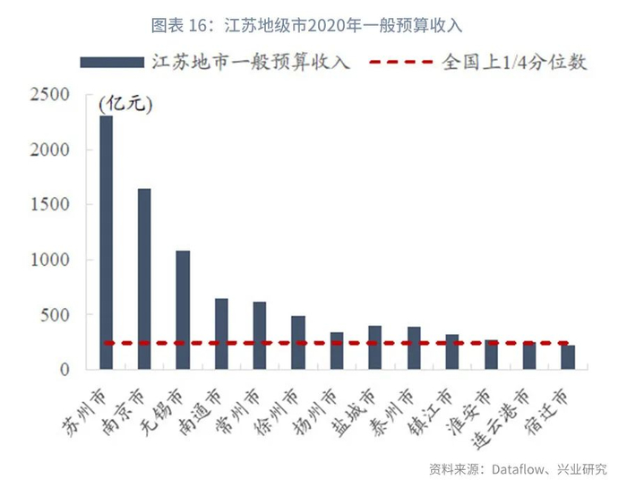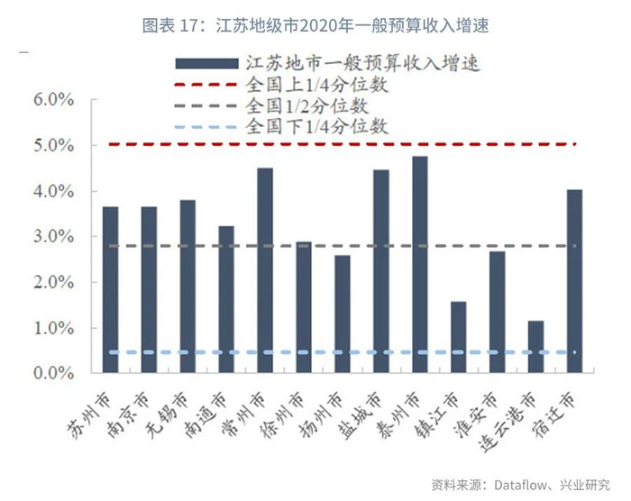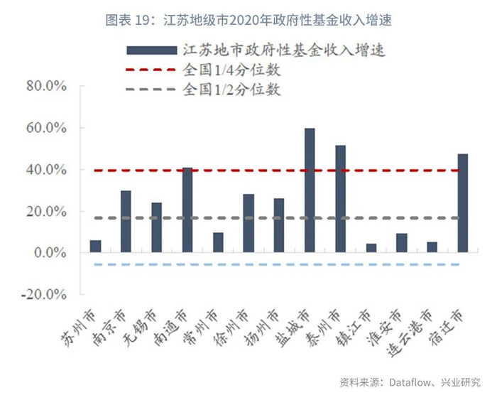 分区县来看,我们统计了江苏省95个区县的一般预算收入及政府性基金收入。一般预算收入的下1/4、1/2、上1/4分位数分别为30.54、53.57、95.94亿元,一般预算收入同比增速的下1/4、1/2、上1/4分位数分别为2.24%、3.84%、5.43%。政府性基金收入的下1/4、1/2、上1/4分位数分别为30.10、55.07、120.68亿元,政府性基金收入同比增速的下1/4、1/2、上1/4分位数分别为6.76%、25.24%、54.19%。