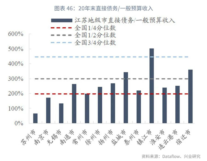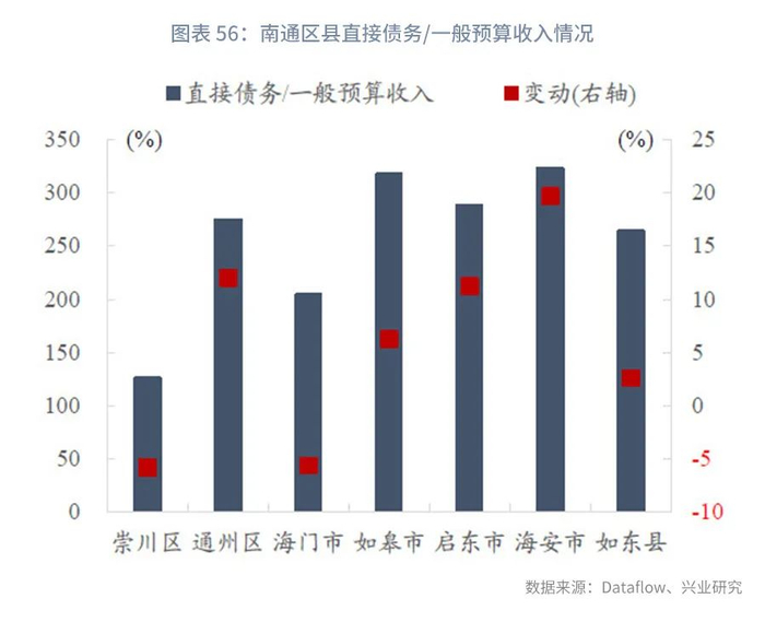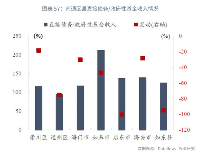南通市下辖区县的直接债务/一般预算收入指标整体偏高,直接债务/政府性基金收入则普遍较低。从直接债务/一般预算收入来看,如皋市、海安市均超过300%,高于省内3/4分位数水平;通州区、启东市、海门市、如东县则高于省内最高的1/2分位数;仅崇川区未超过省内中位数水平。从直接债务/政府性基金收入来看,由于南通市各区县土地出让活跃,该指标普遍较低,仅如皋市的指标值为212.19%,超过了省内最高的1/2分位数;其他大部分区县的指标值处于100%-150%区间内,处于省内1/4-1/2区间内。