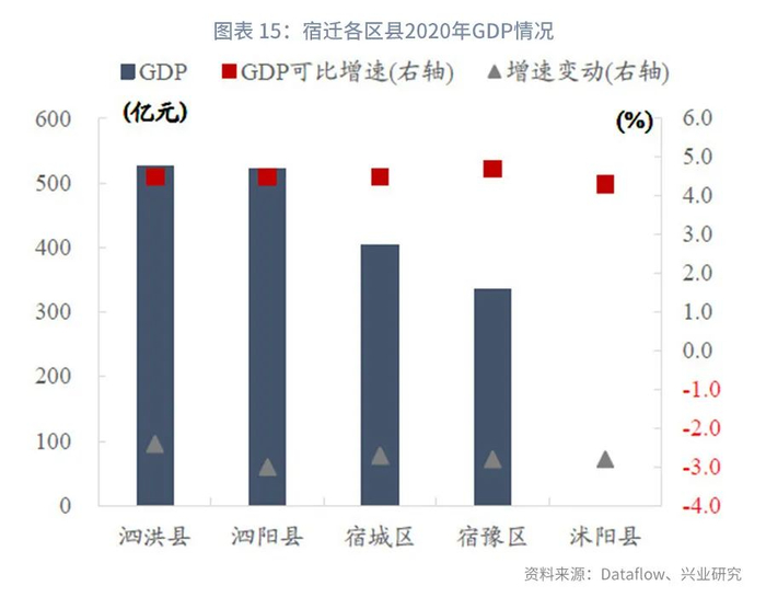 宿迁市下辖区县的经济体量普遍较小,经济增速较高。宿迁市下辖区县共5个,沭阳县尚未披露2020年GDP规模数据,其余4个区县均在省内处于后25%区间内。GDP可比增速方面,各区县均在4.3%及以上,均处于省内前25%水平。