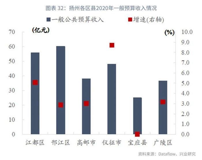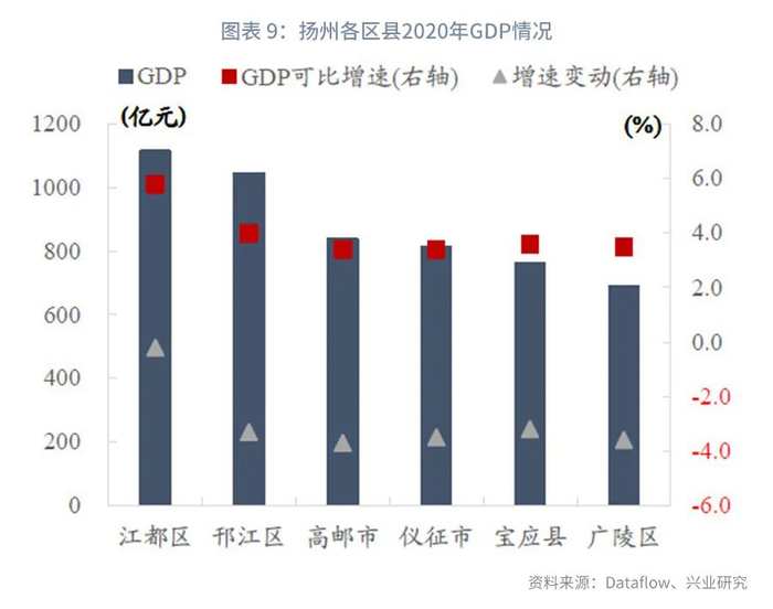 扬州市下辖区县的经济体量尚可,经济增速一般。扬州市下辖区县共6个,20年GDP规模全部处于全省75%-25%区间内,最大的是江都区(1115亿元,全省30%分位数左右),最小的是广陵区(688亿元,全省55%分位数左右)。从GDP可比增速来看,除江都区、邗江区以外,其他4个区县的增速均处于3.4%-3.6%区间内,处于省内后50%的水平。