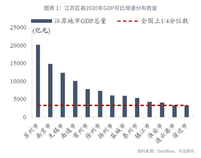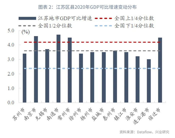 分地级市来看,江苏省各地级市经济体量大,基本均位于全国前1/4分位。从GDP总量来看, 2020年GDP最大的为苏州市(20171亿元),最低的为宿迁市(3262亿元),在全国已披露GDP数据的地级市中仍处于前30%的水平。从GDP增速来看,南京、南通、常州、宿迁的GDP增速超过4.2%,在全国已披露数据的地级市中处于前1/4的水平,其余多数地级市的GDP可比增速处于全国前3/4-1/2的水平,其中连云港市的GDP可比增速最低,为3.0%。