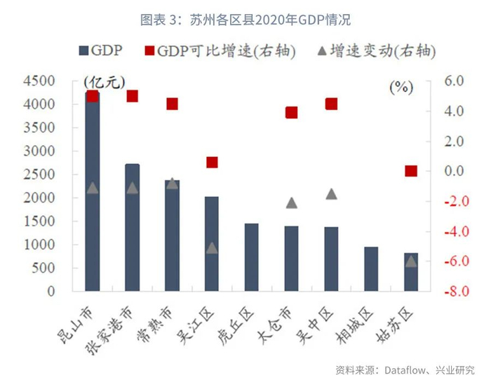 苏州市下辖区县的GDP规模普遍较大,经济增速分化。苏州市下辖区县共9个,GDP基本全部处于省内前1/4的水平,其中昆山市以4250亿元的规模位居省内第一;最小的为老城区姑苏区,2020年GDP为802亿元。从GDP增速来看,疫情影响下各区县的经济增速全部放缓,其中昆山市、张家港市、常熟市、吴中区的可比增速仍保持在4%以上,处于全省前50%的水平,吴江区、姑苏区的的增速则下降至1%以内。